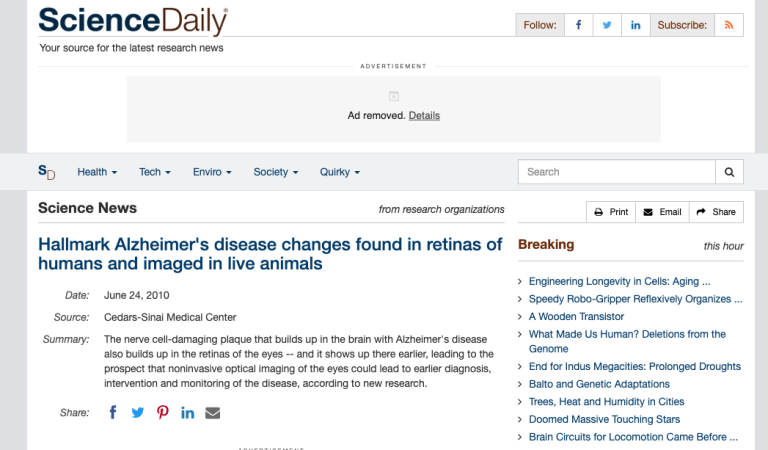 Hallmark Alzheimer’s disease changes found in retinas of humans and imaged in live animals