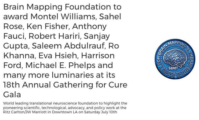 Brain Mapping Foundation to award Montel Williams, Sahel Rose, Ken Fisher, Anthony Fauci, Robert Hariri, Sanjay Gupta, Saleem Abdulrauf, Ro Khanna, Eva Hsieh, Harrison Ford, Michael E. Phelps and many more luminaries at its 18th Annual Gathering for Cure Gala