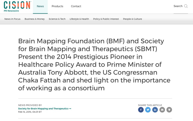 Brain Mapping Foundation (BMF) and Society for Brain Mapping and Therapeutics (SBMT) Present the 2014 Prestigious Pioneer in Healthcare Policy Award to Prime Minister of Australia Tony Abbott, the US Congressman Chaka Fattah and shed light on the importance of working as a consortium