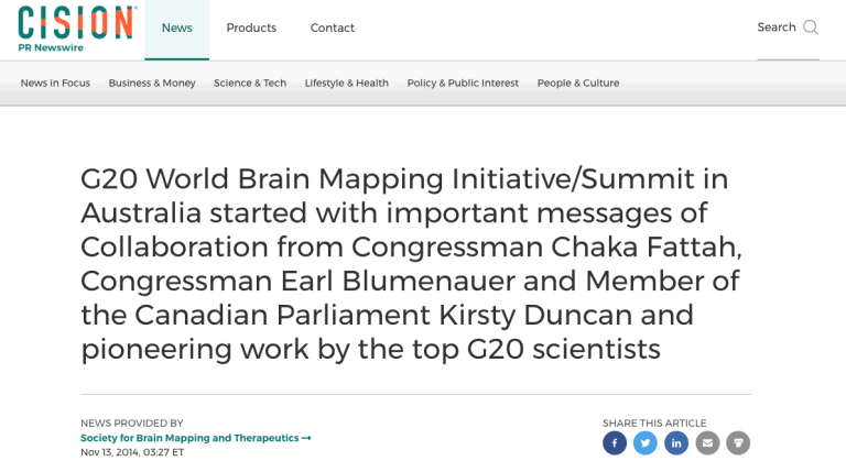 G20 World Brain Mapping Initiative/Summit in Australia started with important messages of Collaboration from Congressman Chaka Fattah, Congressman Earl Blumenauer and Member of the Canadian Parliament Kirsty Duncan and pioneering work by the top G20 scientist